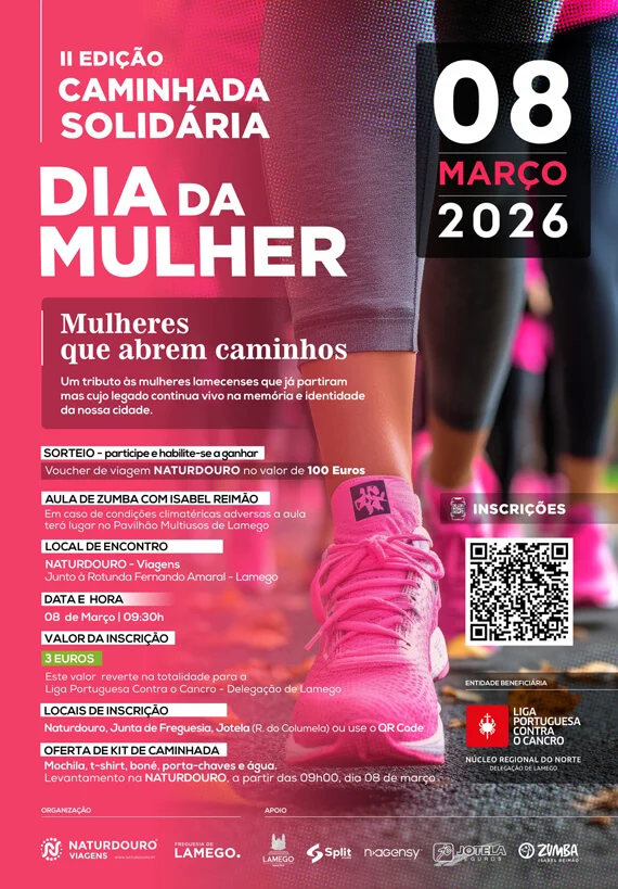 A Junta de Freguesia de Lamego, em parceria com a Naturdouro, organiza a Caminhada Solidária do Dia da Mulher. Esta iniciativa que a Naturdouro Viagens leva a cabo pelo segundo ano consecutivo, pretende-se que seja um momento especial de união, memória e solidariedade.